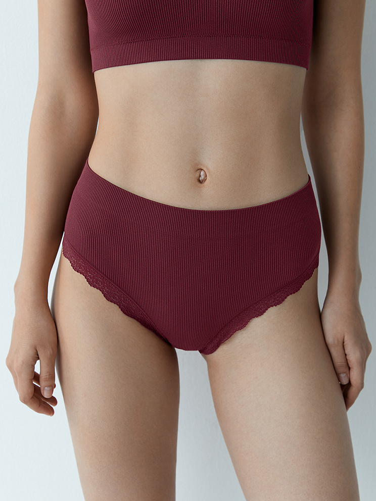 Комфортные трусы-слипы в рубчик со средней линией талии и широкой боковиной. Вырезы по линии бедра обработаны ажурным кружевом с изящным цветочным рисунком.